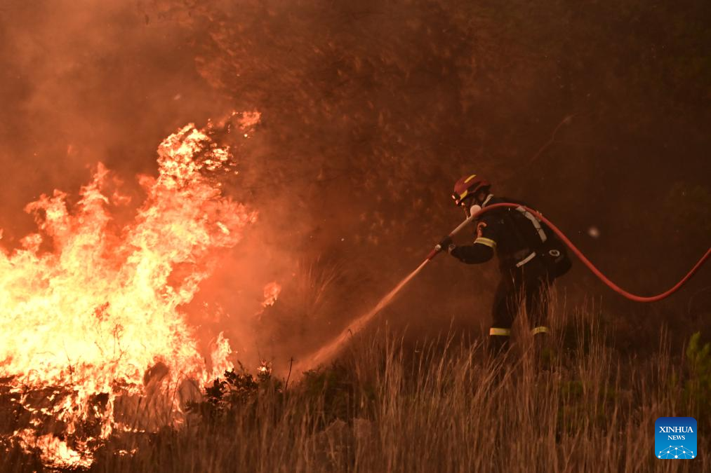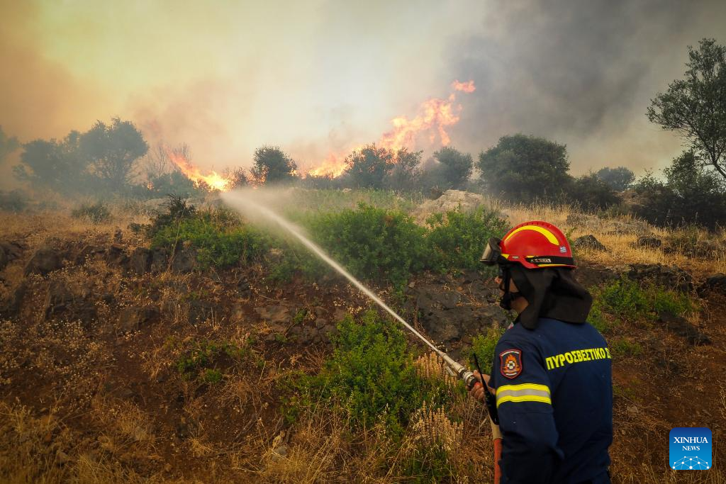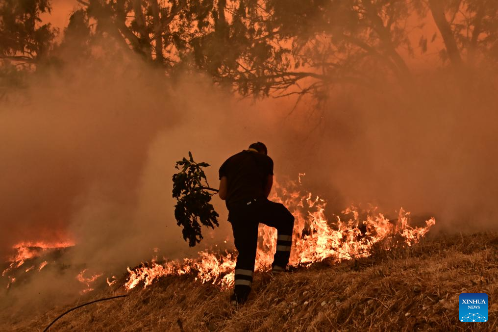 A firefighter battles the flames in Drosopigi, East Attica region of Greece, July 26, 2025. Wildfires broke out in many places across Greece on Saturday, due to the extreme heatwaves recently. The Greek government has requested assistance from the European Union Civil Protection Mechanism to combat the fire. (Photo by krioneri tatiana bolari/Xinhua)