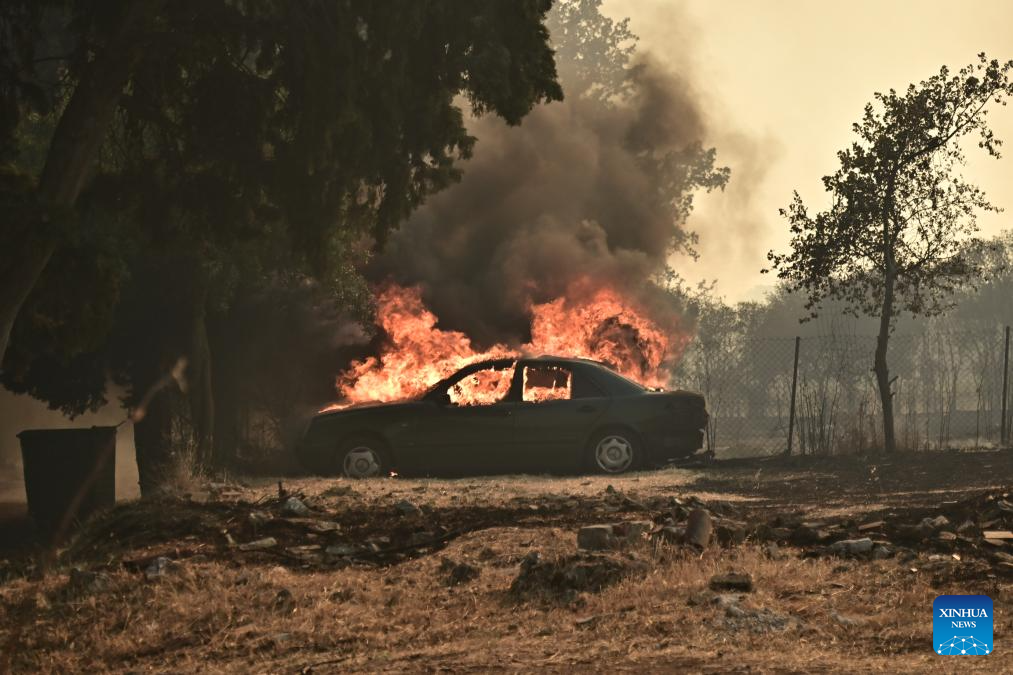 A car is on fire in Drosopigi, East Attica region of Greece, July 26, 2025. Wildfires broke out in many places across Greece on Saturday, due to the extreme heatwaves recently. The Greek government has requested assistance from the European Union Civil Protection Mechanism to combat the fire. (Photo by krioneri tatiana bolari/Xinhua)