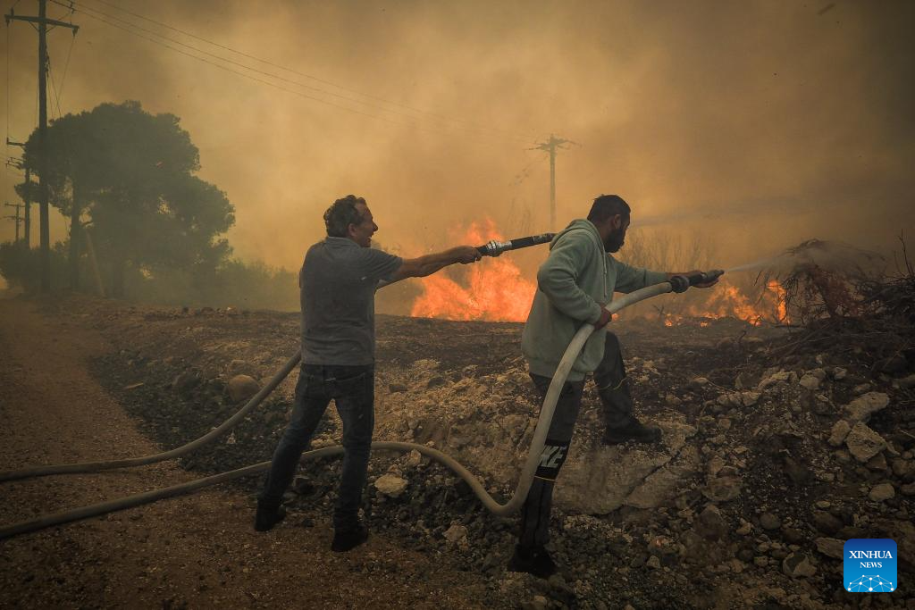 Rescuers battle the flames in Drosopigi, East Attica region of Greece, July 26, 2025. Wildfires broke out in many places across Greece on Saturday, due to the extreme heatwaves recently. The Greek government has requested assistance from the European Union Civil Protection Mechanism to combat the fire. (Photo by krioneri tatiana bolari/Xinhua)
