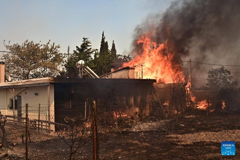 The buildings are on fire in Drosopigi, East Attica region of Greece, July 26, 2025. Wildfires broke out in many places across Greece on Saturday, due to the extreme heatwaves recently. The Greek government has requested assistance from the European Union Civil Protection Mechanism to combat the fire. (Photo by krioneri tatiana bolari/Xinhua)