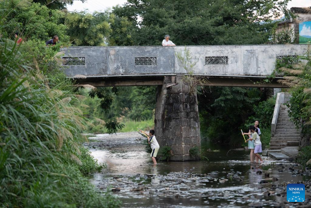 Children have fun in a creek in Fengwu Village, Yixian County, Huangshan City, east China's Anhui Province, July 24, 2025. (Xinhua/Zhang Duan)