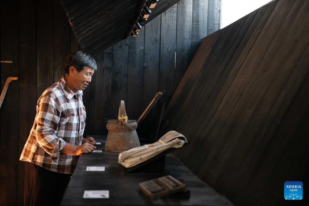 Villager Zhu Zaolian views exhibits at the Village Memory Museum in Fengwu Village, Yixian County, Huangshan City, east China's Anhui Province, July 24, 2025. (Xinhua/Zhang Duan)