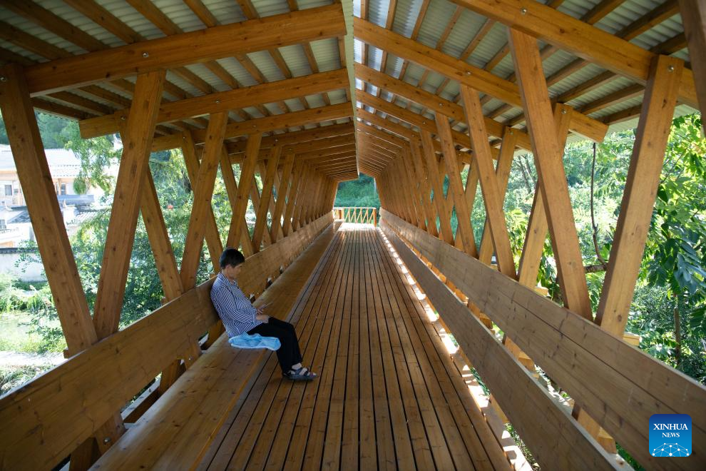 A villager rests on a covered bridge in Fengwu Village, Yixian County, Huangshan City, east China's Anhui Province, July 24, 2025. (Xinhua/Zhang Duan)
