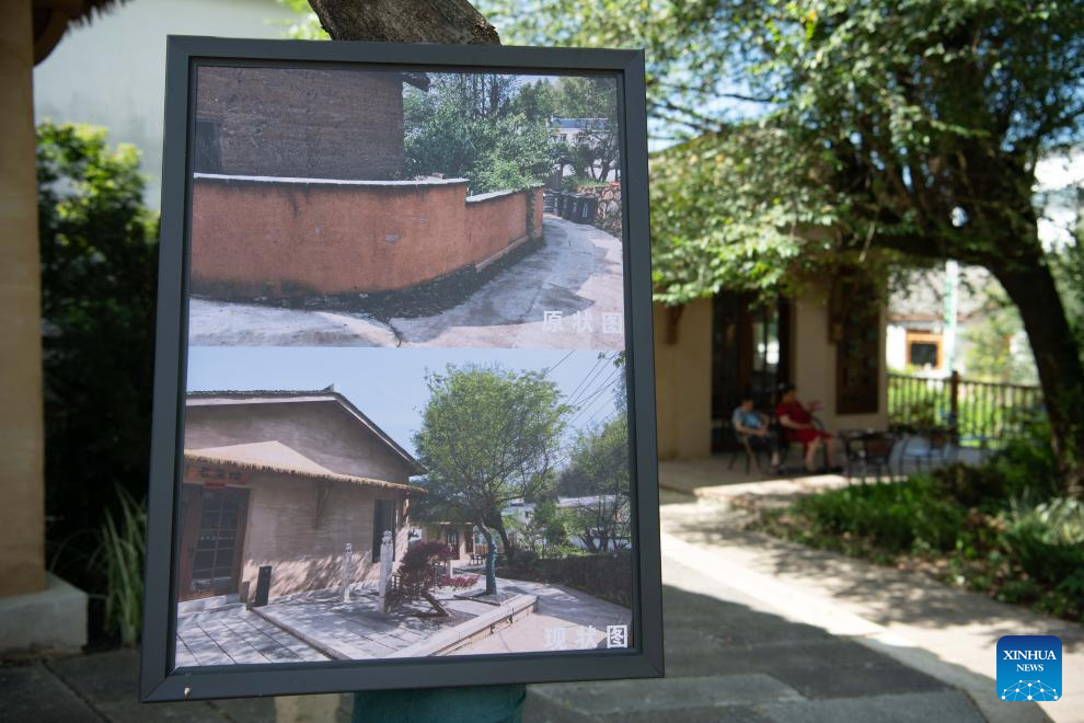 A printed photo displaying a view of Fengwu Village before and after renovation is pictured in Fengwu Village, Yixian County, Huangshan City, east China's Anhui Province, July 25, 2025. (Xinhua/Zhang Duan)