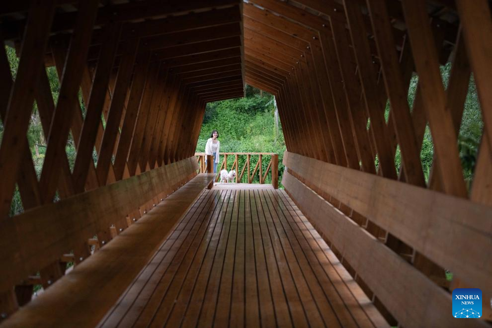 A tourist walks on a covered bridge in Fengwu Village, Yixian County, Huangshan City, east China's Anhui Province, July 24, 2025. (Xinhua/Zhang Duan)