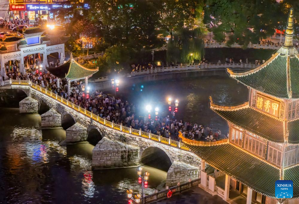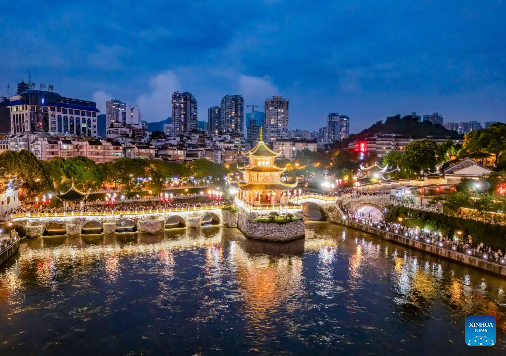 An aerial drone photo taken on July 30, 2025 shows people visiting Jiaxiu tower scenic area in Guiyang, capital of southwest China's Guizhou Province. Guizhou Province, with its cool climate and rich tourism resources, attracts tourists from all over the country during the peak summer travel season. (Xinhua/Liu Xu)