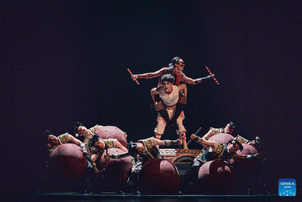 Dance drama "Odes to Heroes," performed by Guangzhou Song and Dance Theatre, is staged at the Beijing Tianqiao Performing Arts Center in Beijing, capital of China, July 31, 2025. The dance drama combines traditional Yingge, or "dance to the hero's song," intangible cultural heritage elements with modern stage art techniques. (Xinhua)