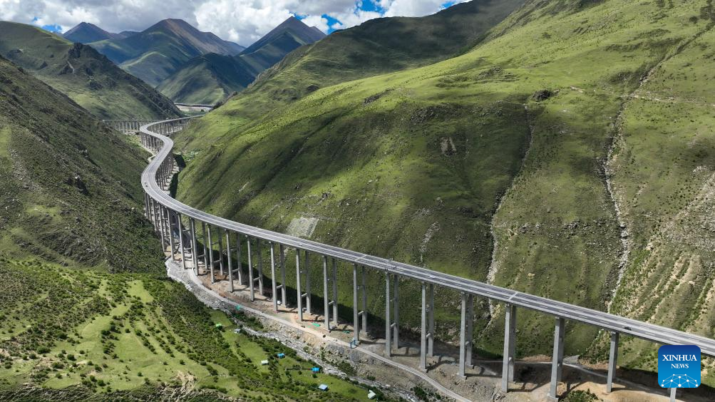 This aerial drone photo taken on July 31, 2025 shows the high-grade highway from Lhasa to Zedang in southwest China's Xizang Autonomous Region. From 2012 to 2024, Xizang has completed a total investment of 401.925 billion yuan (about 55.86 billion U.S. dollars) in fixed assets in highway transportation, and the total highway mileage has increased from 65,200 kilometers in 2012 to 124,900 kilometers by the end of 2024.
