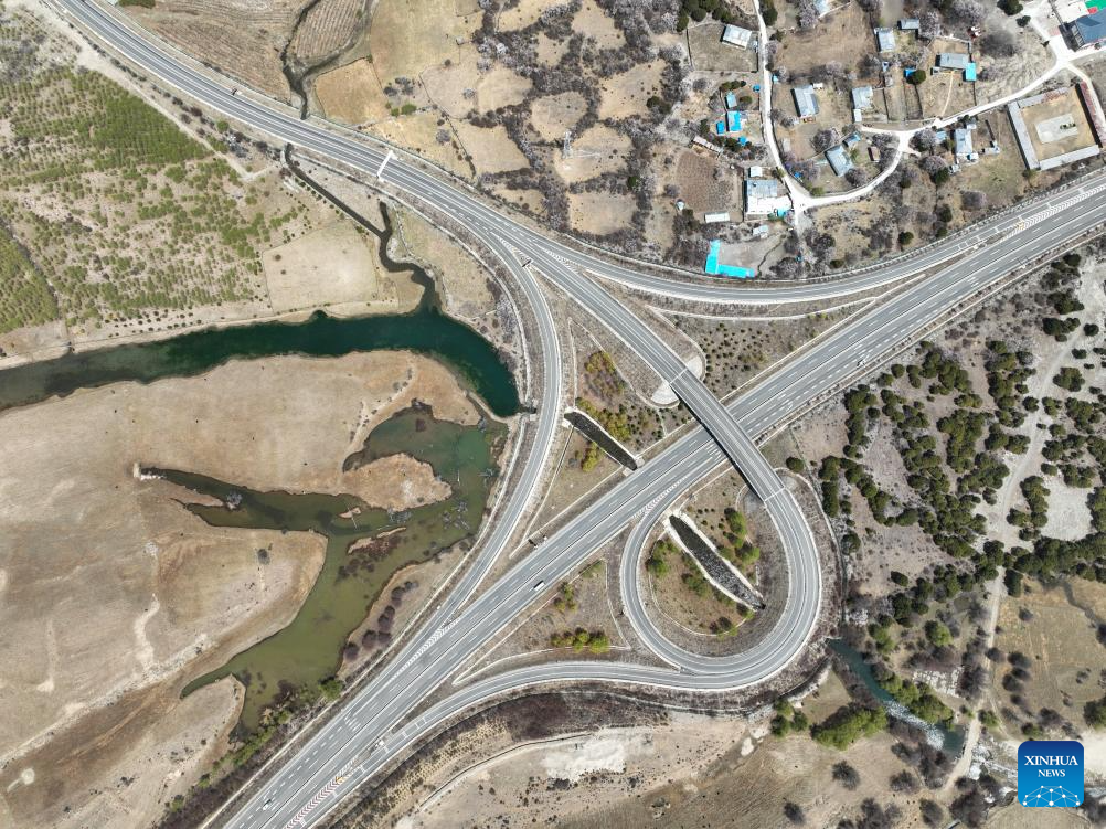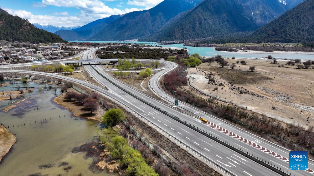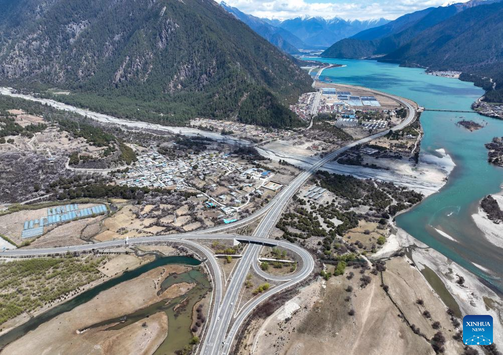 This aerial drone photo taken on April 1, 2025 shows the high-grade highway from Lhasa to Nyingchi in southwest China's Xizang Autonomous Region. From 2012 to 2024, Xizang has completed a total investment of 401.925 billion yuan (about 55.86 billion U.S. dollars) in fixed assets in highway transportation, and the total highway mileage has increased from 65,200 kilometers in 2012 to 124,900 kilometers by the end of 2024.