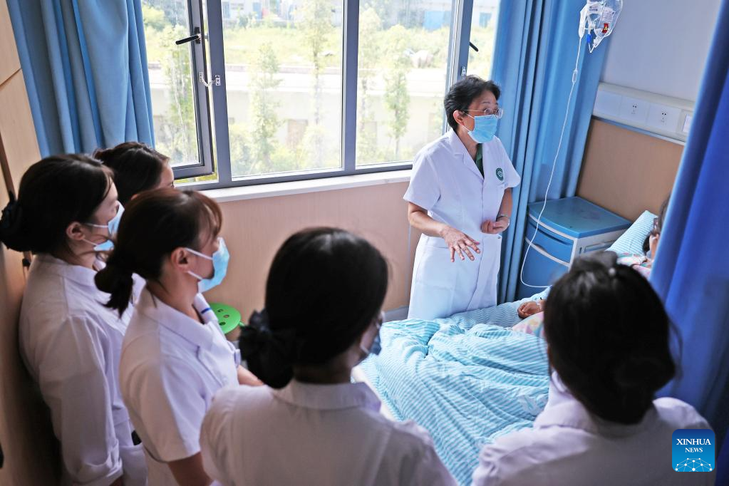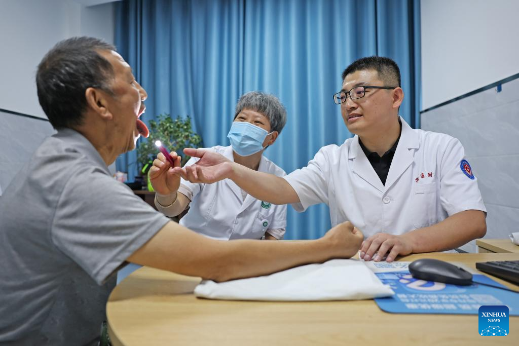 Doctor Shao Lizhu (C) inspects a patient at Renmin Hospital of Leibo County, Liangshan Yi Autonomous Prefecture, southwest China's Sichuan Province, Aug. 1, 2025. A team of medical experts arrived at Renmin Hospital of Leibo County on Friday, starting a month-long medical aid mission. They will focus on improving the diagnostic and treatment capabilities of the hospital. (Xinhua/Lu Ye)
