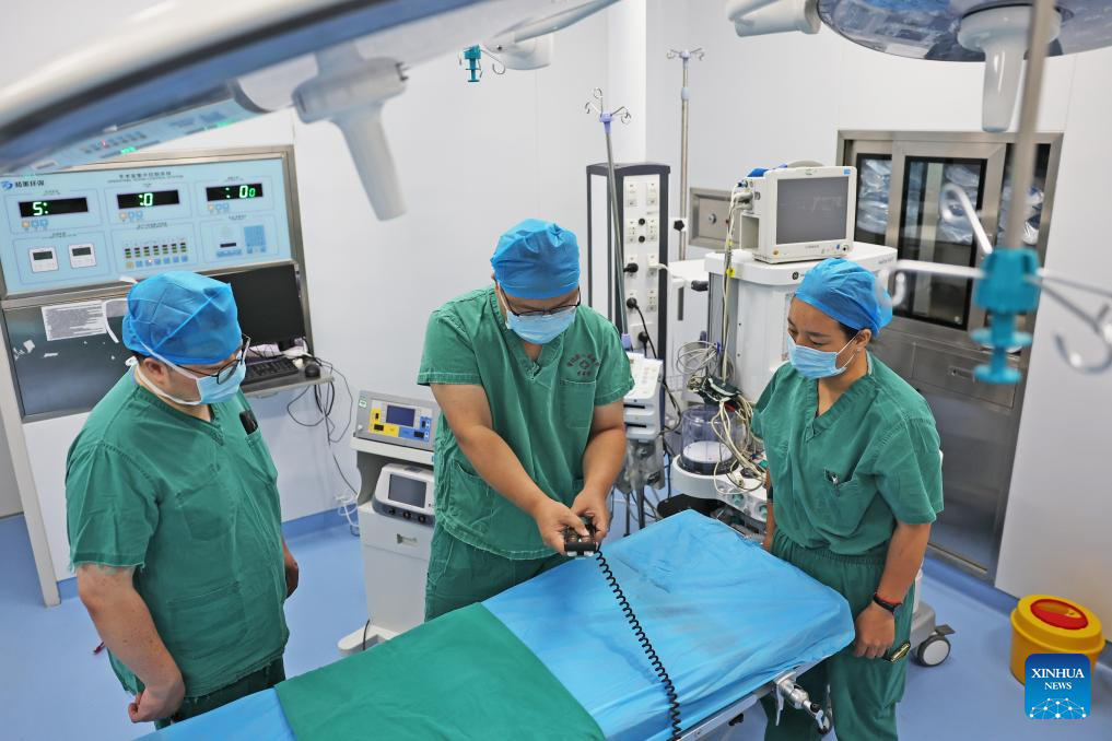Doctor Hu Mengqing (C) checks surgical equipment at Renmin Hospital of Leibo County, Liangshan Yi Autonomous Prefecture, southwest China's Sichuan Province, Aug. 1, 2025. A team of medical experts arrived at Renmin Hospital of Leibo County on Friday, starting a month-long medical aid mission. They will focus on improving the diagnostic and treatment capabilities of the hospital. (Xinhua/Lu Ye)