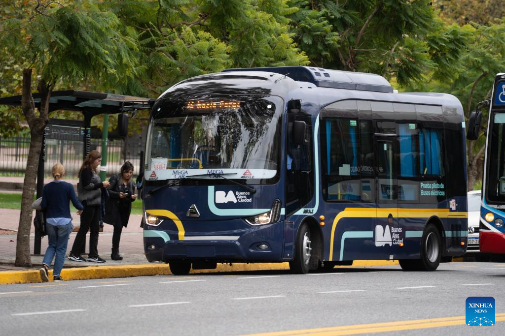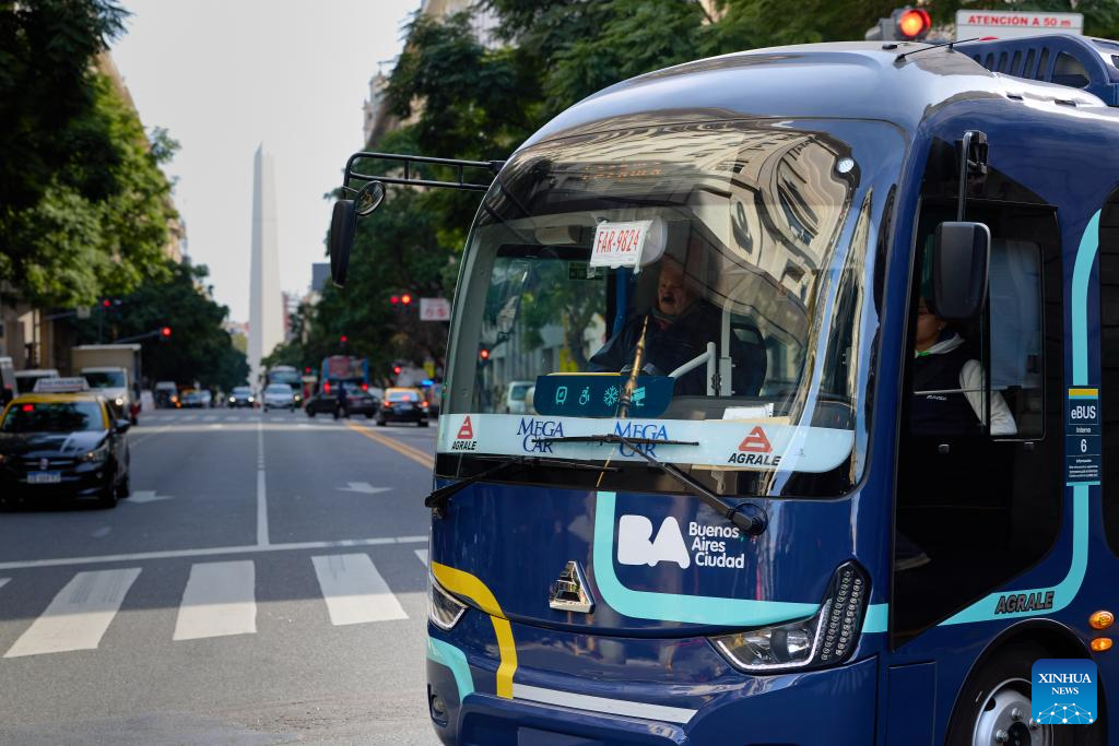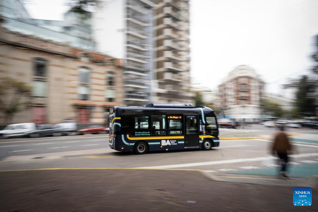 An electric bus manufactured by Yangzhou Asiastar Bus Co., Ltd. runs on the street in Buenos Aires, Argentina, May 7, 2025. In May 2025, Buenos Aires of Argentina launched its first all-electric-bus line, deploying 12 electric buses manufactured by Yangzhou Asiastar Bus Co., Ltd. in east China's Jiangsu Province for a two-month trial operation. Between January and February 2025, these vehicles were shipped in two batches, traveling nearly 20,000 kilometers from Jiangsu to Buenos Aires.