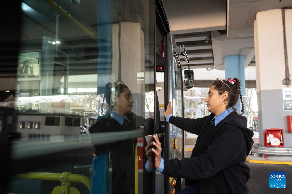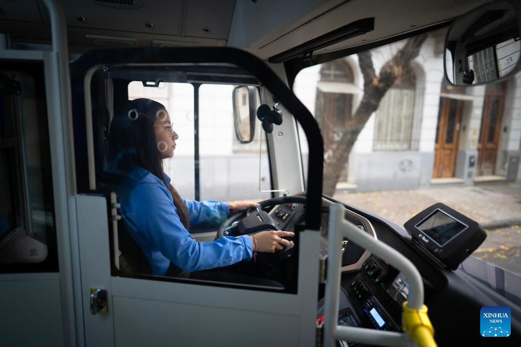 A driver drives an electric bus manufactured by Yangzhou Asiastar Bus Co., Ltd. on the street in Buenos Aires, Argentina, May 7, 2025. In May 2025, Buenos Aires of Argentina launched its first all-electric-bus line, deploying 12 electric buses manufactured by Yangzhou Asiastar Bus Co., Ltd. in east China's Jiangsu Province for a two-month trial operation. Between January and February 2025, these vehicles were shipped in two batches, traveling nearly 20,000 kilometers from Jiangsu to Buenos Aires.