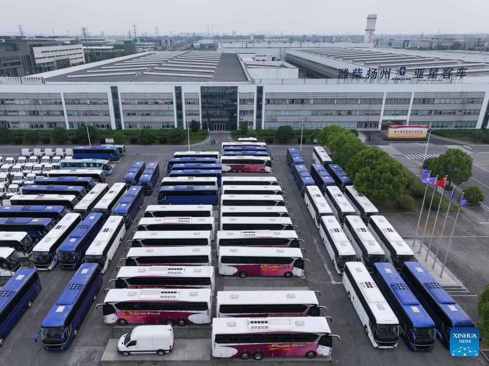 A drone photo shows a view of Yangzhou Asiastar Bus Co., Ltd. in Yangzhou, east China's Jiangsu Province, May 22, 2025. In May 2025, Buenos Aires of Argentina launched its first all-electric-bus line, deploying 12 electric buses manufactured by Yangzhou Asiastar Bus Co., Ltd. in east China's Jiangsu Province for a two-month trial operation. Between January and February 2025, these vehicles were shipped in two batches, traveling nearly 20,000 kilometers from Jiangsu to Buenos Aires.