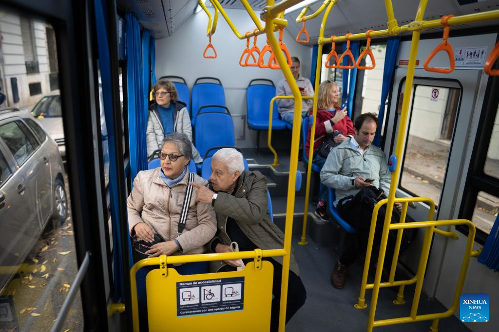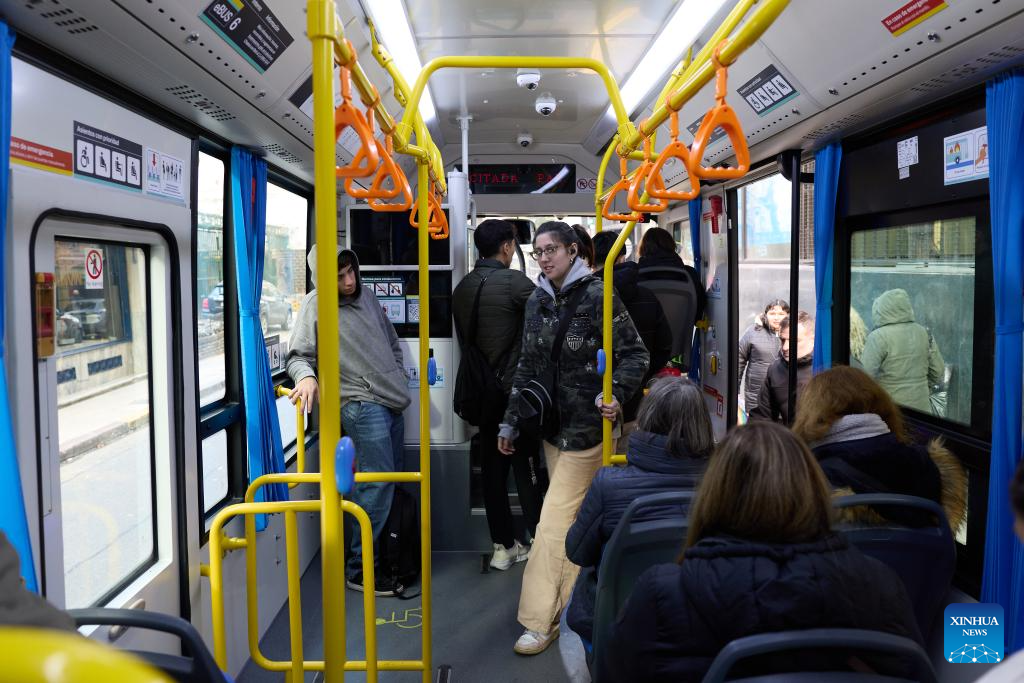 Passengers are pictured on an electric bus manufactured by Yangzhou Asiastar Bus Co., Ltd. in Buenos Aires, Argentina, May 7, 2025. In May 2025, Buenos Aires of Argentina launched its first all-electric-bus line, deploying 12 electric buses manufactured by Yangzhou Asiastar Bus Co., Ltd. in east China's Jiangsu Province for a two-month trial operation. Between January and February 2025, these vehicles were shipped in two batches, traveling nearly 20,000 kilometers from Jiangsu to Buenos Aires.