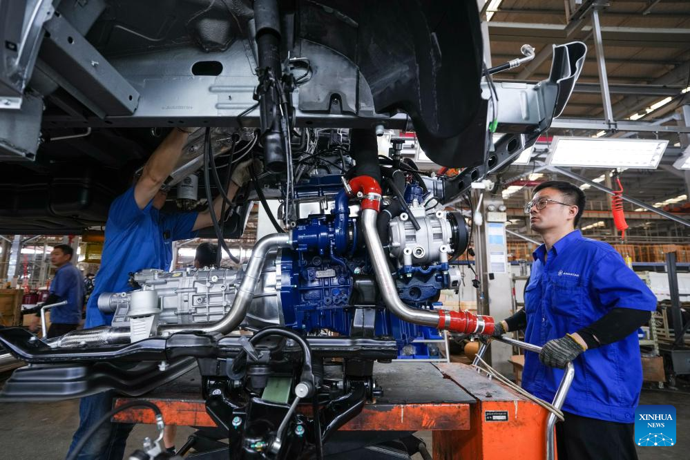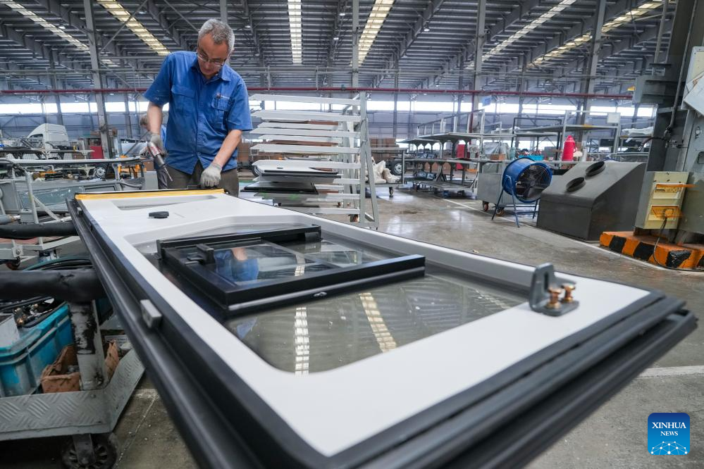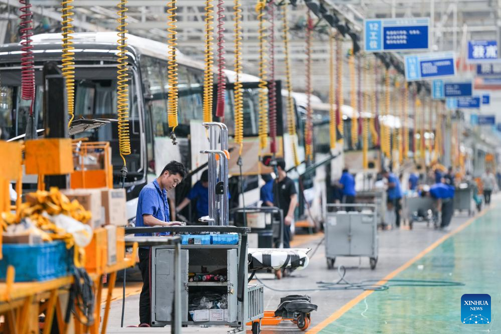 Workers are pictured in a workshop of Yangzhou Asiastar Bus Co., Ltd. in Yangzhou, east China's Jiangsu Province, May 22, 2025. In May 2025, Buenos Aires of Argentina launched its first all-electric-bus line, deploying 12 electric buses manufactured by Yangzhou Asiastar Bus Co., Ltd. in east China's Jiangsu Province for a two-month trial operation. Between January and February 2025, these vehicles were shipped in two batches, traveling nearly 20,000 kilometers from Jiangsu to Buenos Aires.