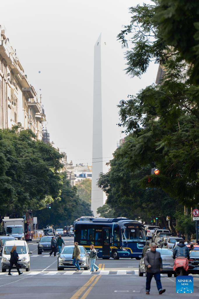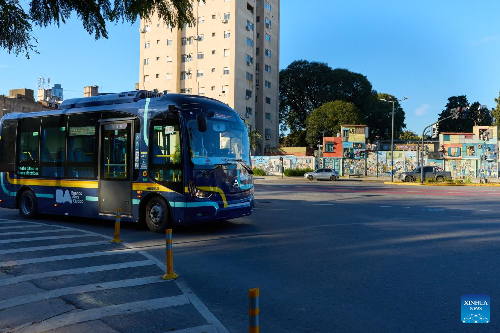An electric bus manufactured by Yangzhou Asiastar Bus Co., Ltd. runs on the street in Buenos Aires, Argentina, July 4, 2025. In May 2025, Buenos Aires of Argentina launched its first all-electric-bus line, deploying 12 electric buses manufactured by Yangzhou Asiastar Bus Co., Ltd. in east China's Jiangsu Province for a two-month trial operation. Between January and February 2025, these vehicles were shipped in two batches, traveling nearly 20,000 kilometers from Jiangsu to Buenos Aires.