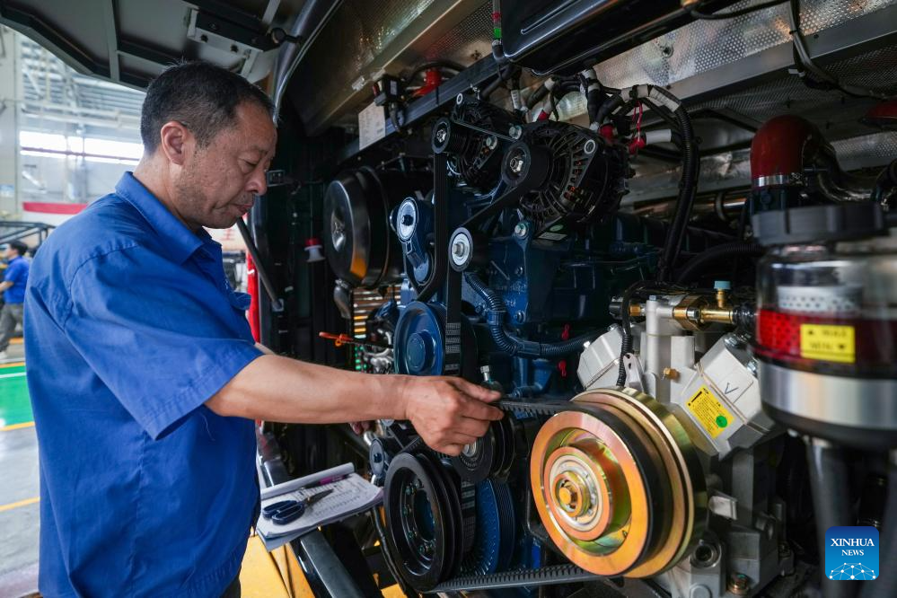 A worker is pictured in a workshop of Yangzhou Asiastar Bus Co., Ltd. in Yangzhou, east China's Jiangsu Province, May 22, 2025. In May 2025, Buenos Aires of Argentina launched its first all-electric-bus line, deploying 12 electric buses manufactured by Yangzhou Asiastar Bus Co., Ltd. in east China's Jiangsu Province for a two-month trial operation. Between January and February 2025, these vehicles were shipped in two batches, traveling nearly 20,000 kilometers from Jiangsu to Buenos Aires.