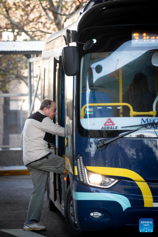 A passenger gets on an electric bus manufactured by Yangzhou Asiastar Bus Co., Ltd. in Buenos Aires, Argentina, July 4, 2025. In May 2025, Buenos Aires of Argentina launched its first all-electric-bus line, deploying 12 electric buses manufactured by Yangzhou Asiastar Bus Co., Ltd. in east China's Jiangsu Province for a two-month trial operation. Between January and February 2025, these vehicles were shipped in two batches, traveling nearly 20,000 kilometers from Jiangsu to Buenos Aires.