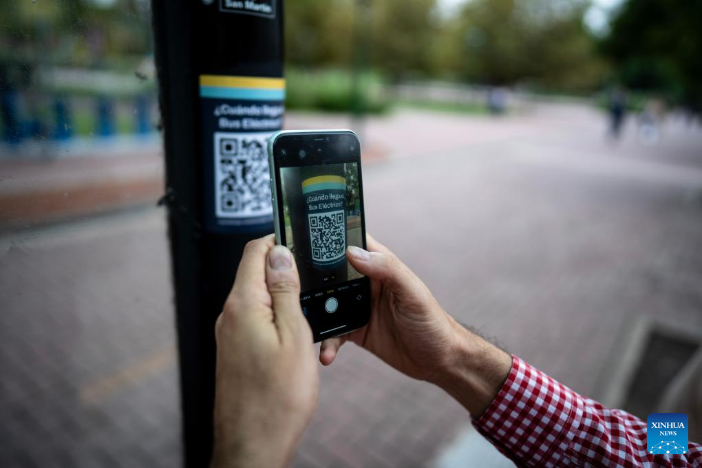 A passenger scans QR code to learn about the operation of electric bus in Buenos Aires, Argentina, May 7, 2025. In May 2025, Buenos Aires of Argentina launched its first all-electric-bus line, deploying 12 electric buses manufactured by Yangzhou Asiastar Bus Co., Ltd. in east China's Jiangsu Province for a two-month trial operation. Between January and February 2025, these vehicles were shipped in two batches, traveling nearly 20,000 kilometers from Jiangsu to Buenos Aires.