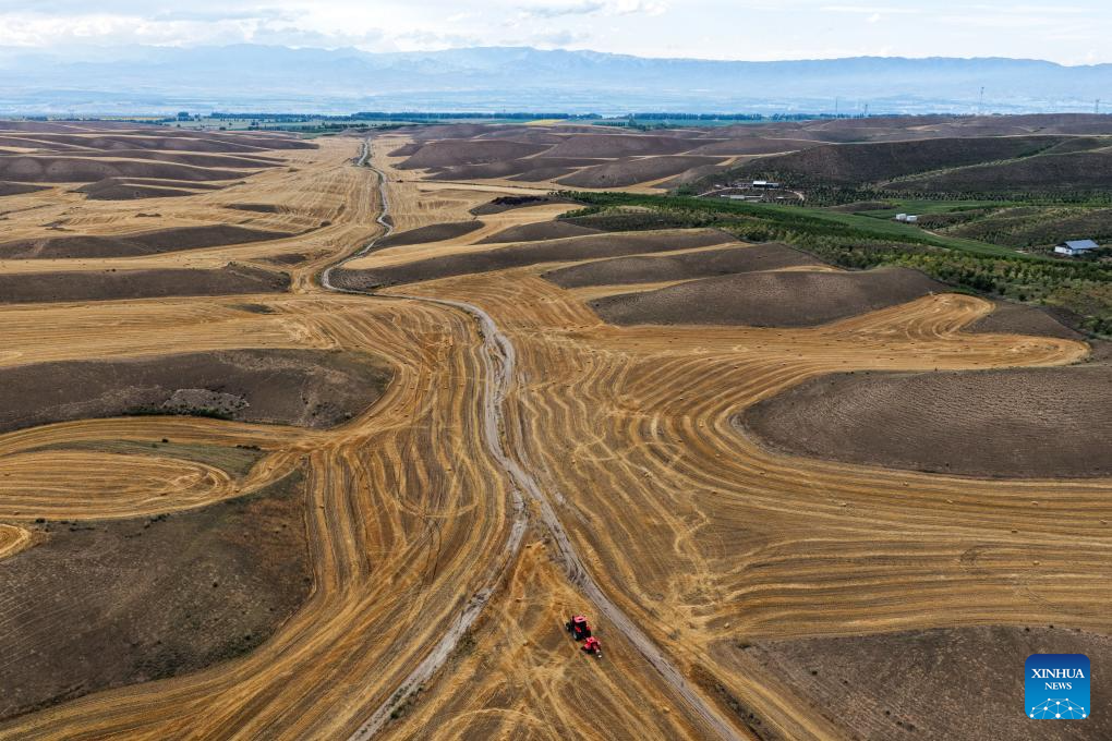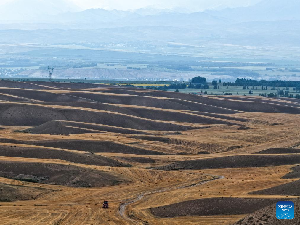 An aerial drone photo taken on July 31, 2025 shows wheat fields in Tekes County, Ili Kazak Autonomous Prefecture, northwest China's Xinjiang Uygur Autonomous Region. Mature wheat is ready for harvest in Tekes. Local farmers are seizing favorable weather conditions to conduct summer harvesting. (Xinhua/Zhao Yusi)