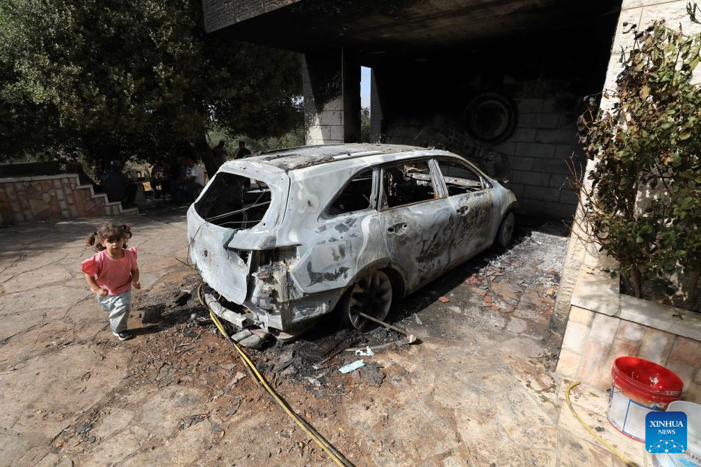A Palestinian inspects a burnt car following an Israeli settler attack in the village of Silwad, in the West Bank city of Ramallah, on July 31, 2025. (Photo by Nidal Eshtayeh/Xinhua)
