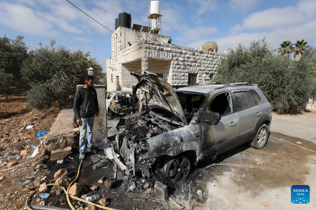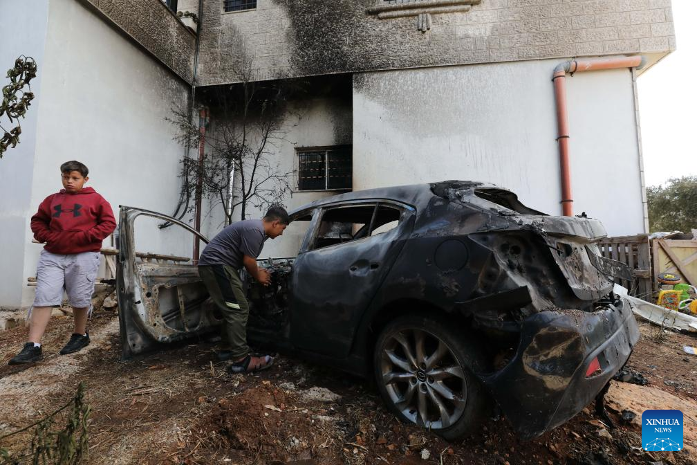 Palestinians inspect a burnt car following an Israeli settler attack in the village of Silwad, in the West Bank city of Ramallah, on July 31, 2025. (Photo by Nidal Eshtayeh/Xinhua)