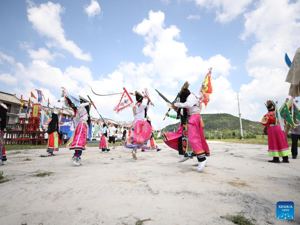 Actors take part in a Dixi opera parade at the Miaoling Tunpu scenic area in Xixiu District of Anshun City, southwest China's Guizhou Province, Aug. 2, 2025. Anshun Dixi Opera is an important part of Tunpu culture dating back to the Ming Dynasty (1368-1644). The opera has been listed as a national intangible cultural heritage item in 2006. (Photo by Chen Xi/Xinhua)