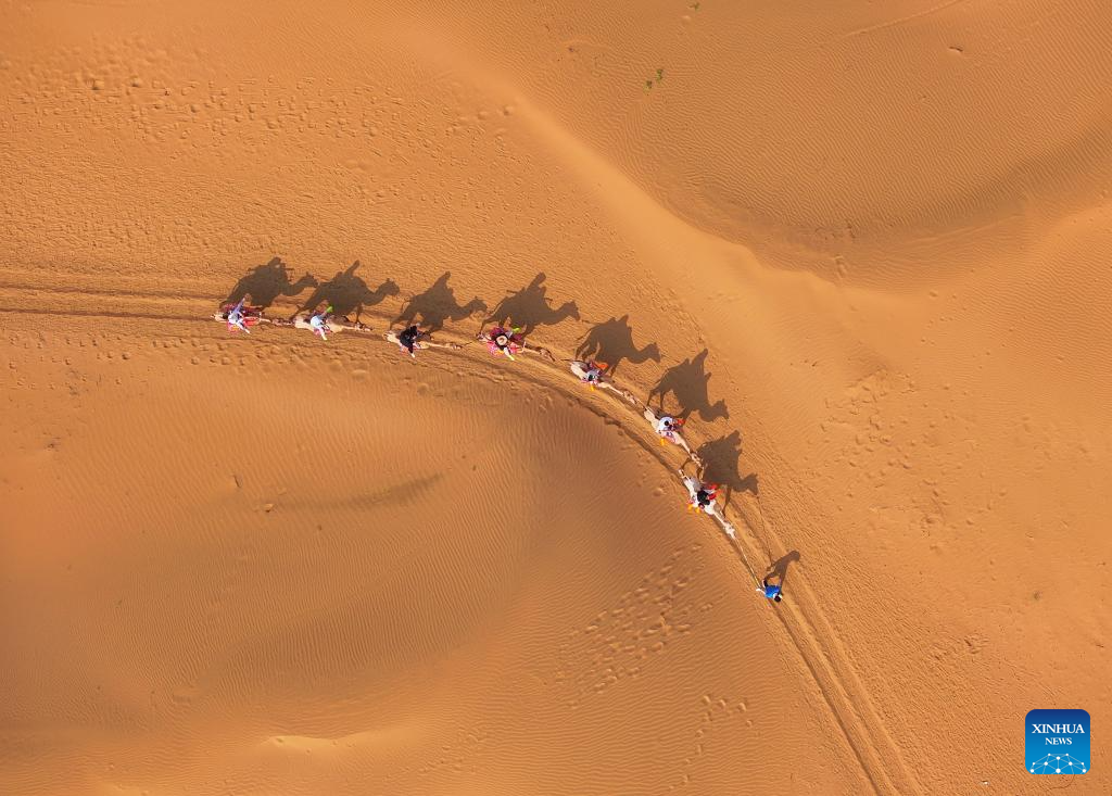 An aerial drone photo taken on Aug. 1, 2025 shows people riding camels at a desert scenic area in Dalad Banner of Erdos City, north China's Inner Mongolia Autonomous Region. Kubuqi desert in Erdos City has entered its peak tourist season in midsummer, attracting numerous tourists from around the country to visit. (Xinhua/Lian Zhen)