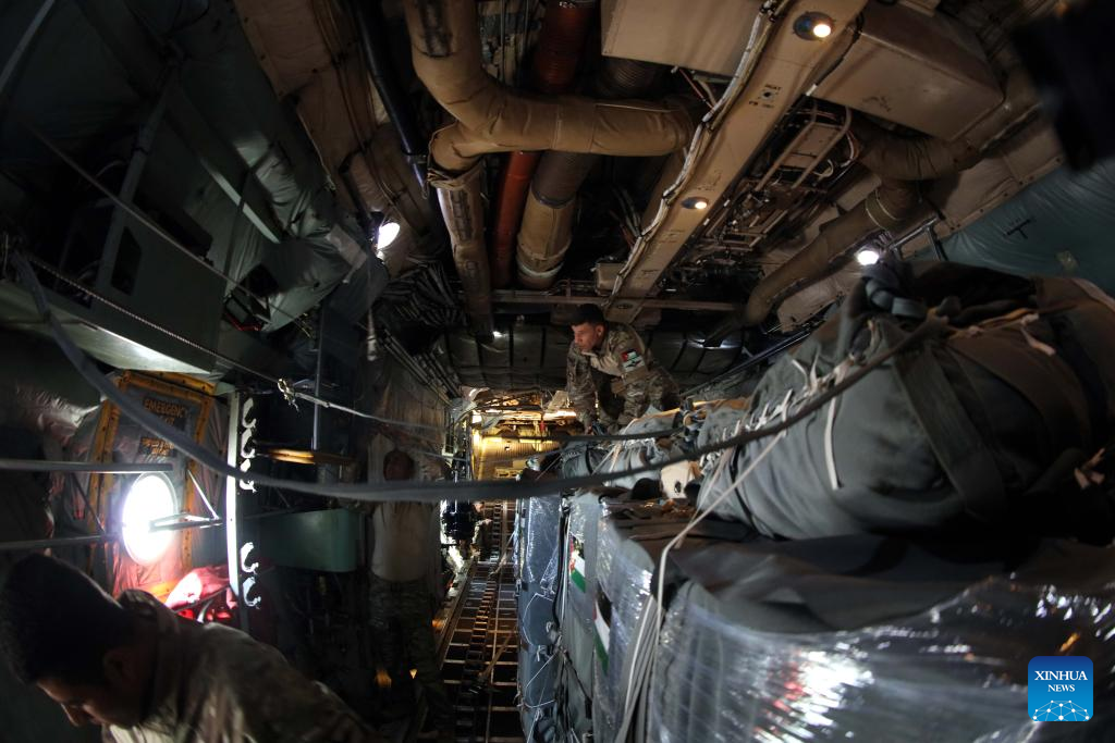 Jordanian servicemen prepare to drop humanitarian aid over Gaza, on Aug. 1, 2025. Several countries, including Jordan, Egypt, Germany, the United Arab Emirates (UAE), France and Spain, on Friday executed joint airdrops in Gaza, delivering humanitarian aid into the enclave. (Photo by Mohammad Abu Ghosh/Xinhua)