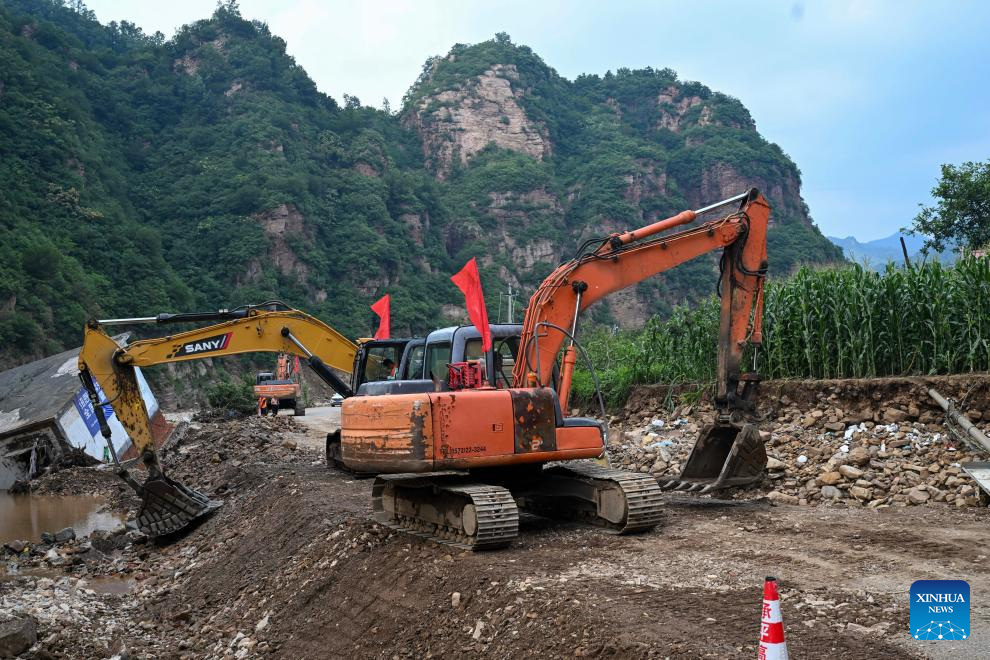 Staff members operate diggers to repair a damaged road in Liudaogou Village in Liudaohe Town, Xinglong County of north China's Hebei Province, Aug. 1, 2025. Affected by heavy rainfall, some roads and houses were damaged in several villages in Liudaohe Town. In recent days, local authorities have actively organized efforts to carry out relief operations to restore roads, power supply, and communication facilities, along with environmental disinfection measures. (Photo by Wang Liqun/Xinhua)