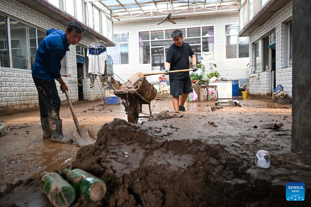 Villagers clean up silt in Liudaogou Village in Liudaohe Town, Xinglong County of north China's Hebei Province, Aug. 1, 2025. Affected by heavy rainfall, some roads and houses were damaged in several villages in Liudaohe Town. In recent days, local authorities have actively organized efforts to carry out relief operations to restore roads, power supply, and communication facilities, along with environmental disinfection measures. (Photo by Wang Liqun/Xinhua)