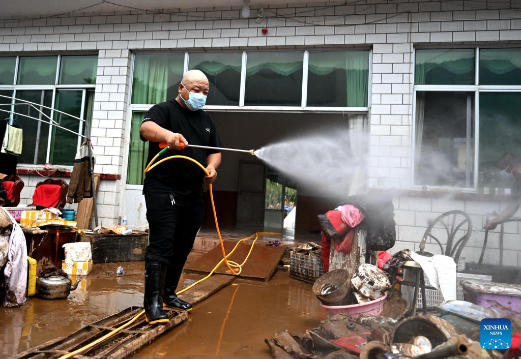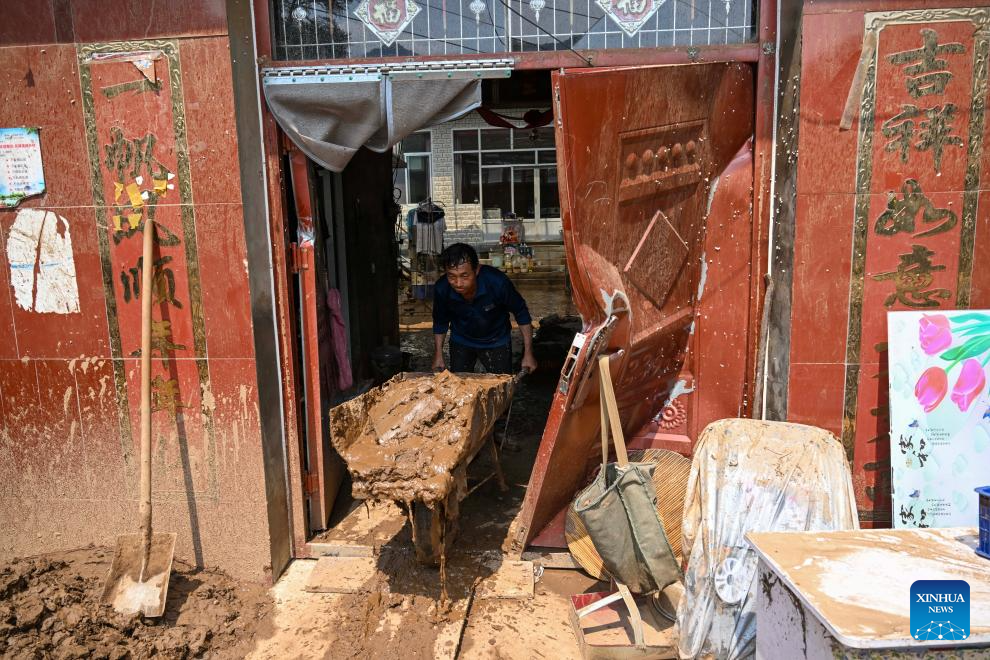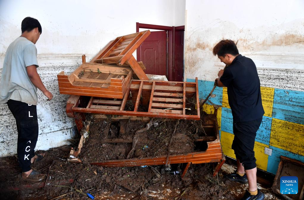 Villagers clean their home in Liudaogou Village in Liudaohe Town, Xinglong County of north China's Hebei Province, Aug. 1, 2025. Affected by heavy rainfall, some roads and houses were damaged in several villages in Liudaohe Town. In recent days, local authorities have organized efforts to carry out relief operations to restore roads, power supply and communication facilities, along with environmental disinfection measures. (Xinhua/Wang Xiao)