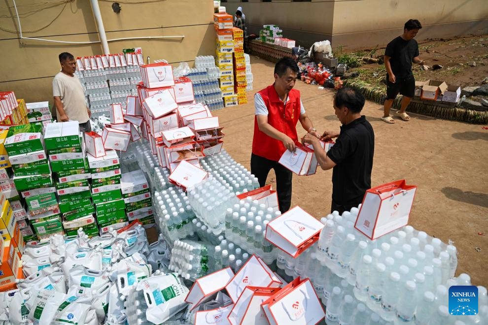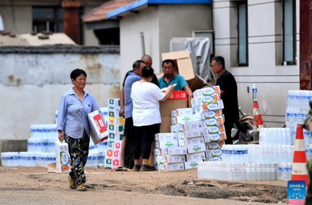 Villagers receive supplies in Nantai Village in Liudaohe Town, Xinglong County of north China's Hebei Province, Aug. 2, 2025. Affected by heavy rainfall, some roads and houses were damaged in several villages in Liudaohe Town. In recent days, local authorities have organized efforts to carry out relief operations to restore roads, power supply and communication facilities, along with environmental disinfection measures. (Xinhua/Wang Xiao)