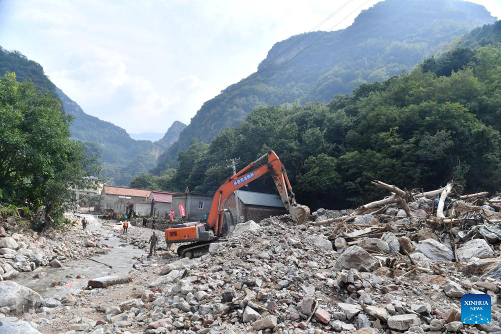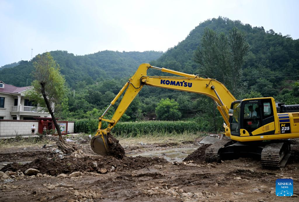 Staff members operate a digger to clean up rocks in Zhujiagou Village in Liudaohe Town, Xinglong County of north China's Hebei Province, Aug. 1, 2025. Affected by heavy rainfall, some roads and houses were damaged in several villages in Liudaohe Town. In recent days, local authorities have organized efforts to carry out relief operations to restore roads, power supply and communication facilities, along with environmental disinfection measures. (Xinhua/Wang Xiao)