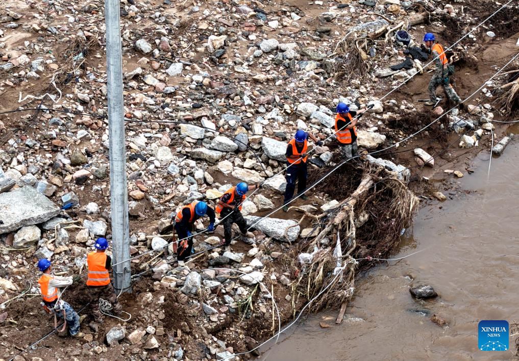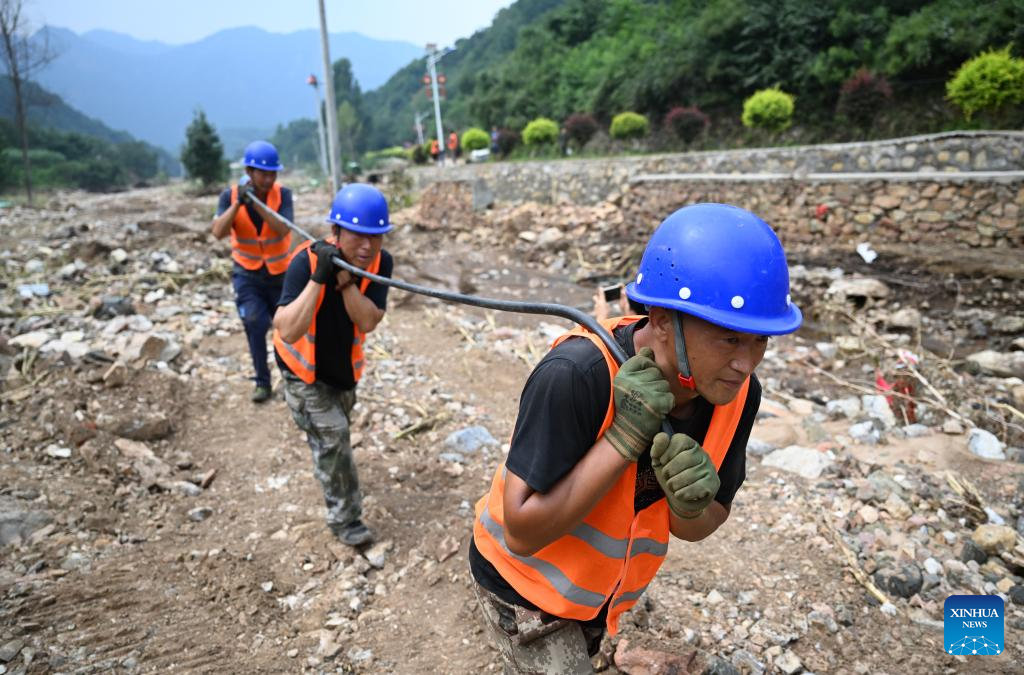 Staff members from the State Grid Corporation of China carry a wire to repair power supply facilities in Nantai Village in Liudaohe Town, Xinglong County of north China's Hebei Province, Aug. 2, 2025. Affected by heavy rainfall, some roads and houses were damaged in several villages in Liudaohe Town. In recent days, local authorities have organized efforts to carry out relief operations to restore roads, power supply and communication facilities, along with environmental disinfection measures. (Xinhua/Wang Xiao)