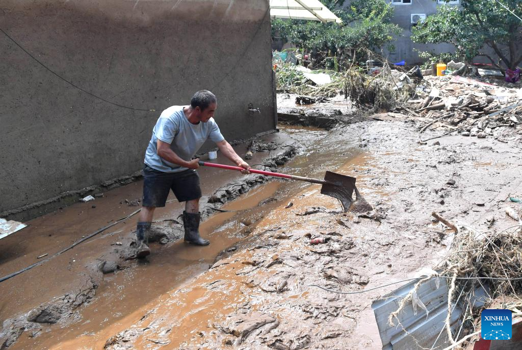 A villager cleans up silt in Liudaogou Village in Liudaohe Town, Xinglong County of north China's Hebei Province, Aug. 1, 2025. Affected by heavy rainfall, some roads and houses were damaged in several villages in Liudaohe Town. In recent days, local authorities have organized efforts to carry out relief operations to restore roads, power supply and communication facilities, along with environmental disinfection measures. (Xinhua/Wang Xiao)