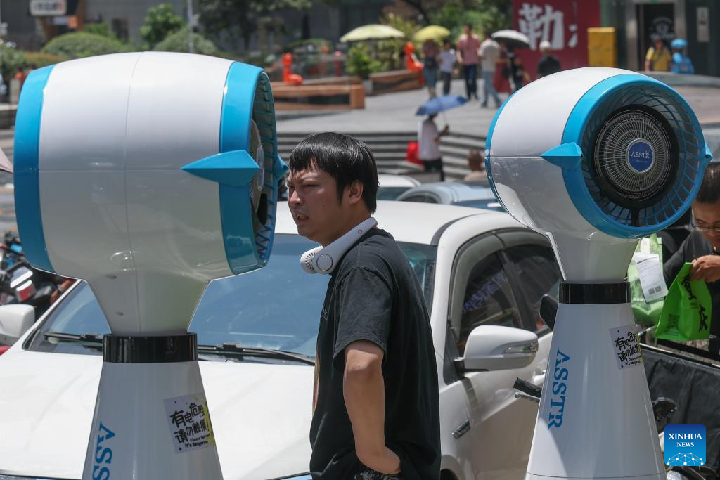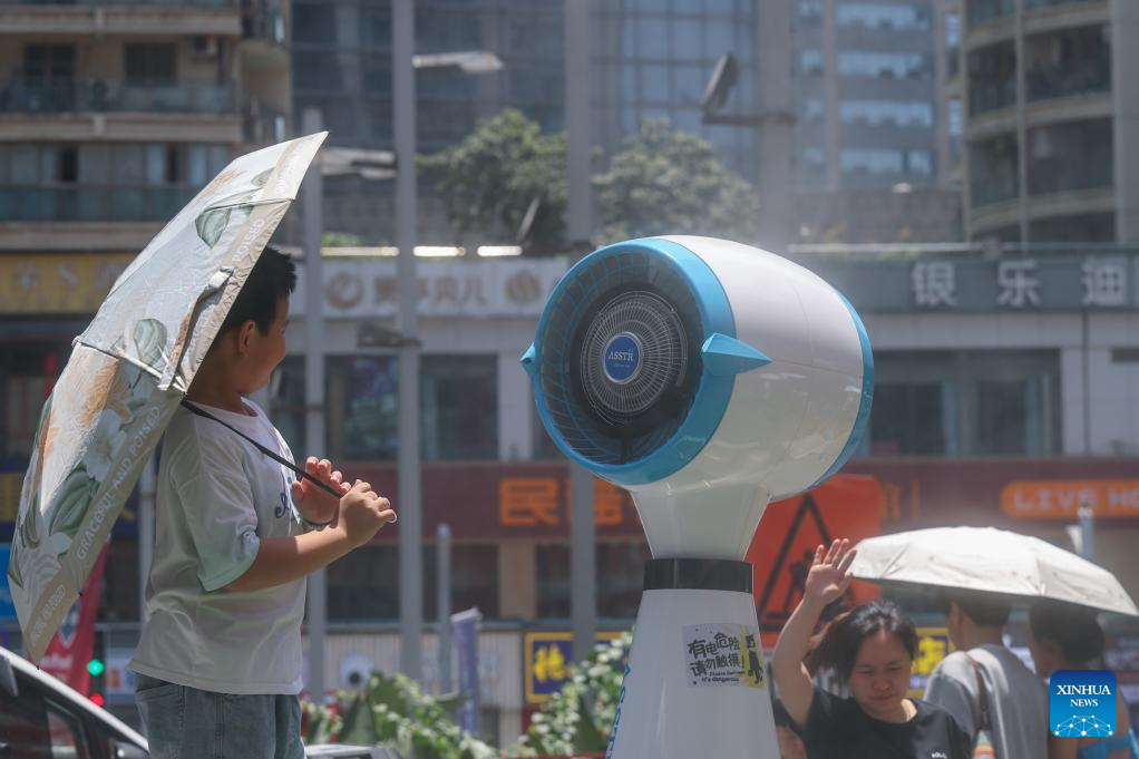A tourist cools off in front of a fan in Jiangbei District, southwest China's Chongqing Municipality, Aug. 2, 2025. Chongqing issued a heatwave alert on Saturday, with high temperature hitting 40-43 degrees Celsius. (Xinhua/Chen Cheng)