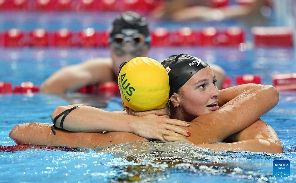 Summer McIntosh (R) of Canada celebrates with Jenna Forrester of Australia after the women's 400m individual medley final of swimming at the World Aquatics Championships in Singapore, Aug. 3, 2025. (Xinhua/Xia Yifang)