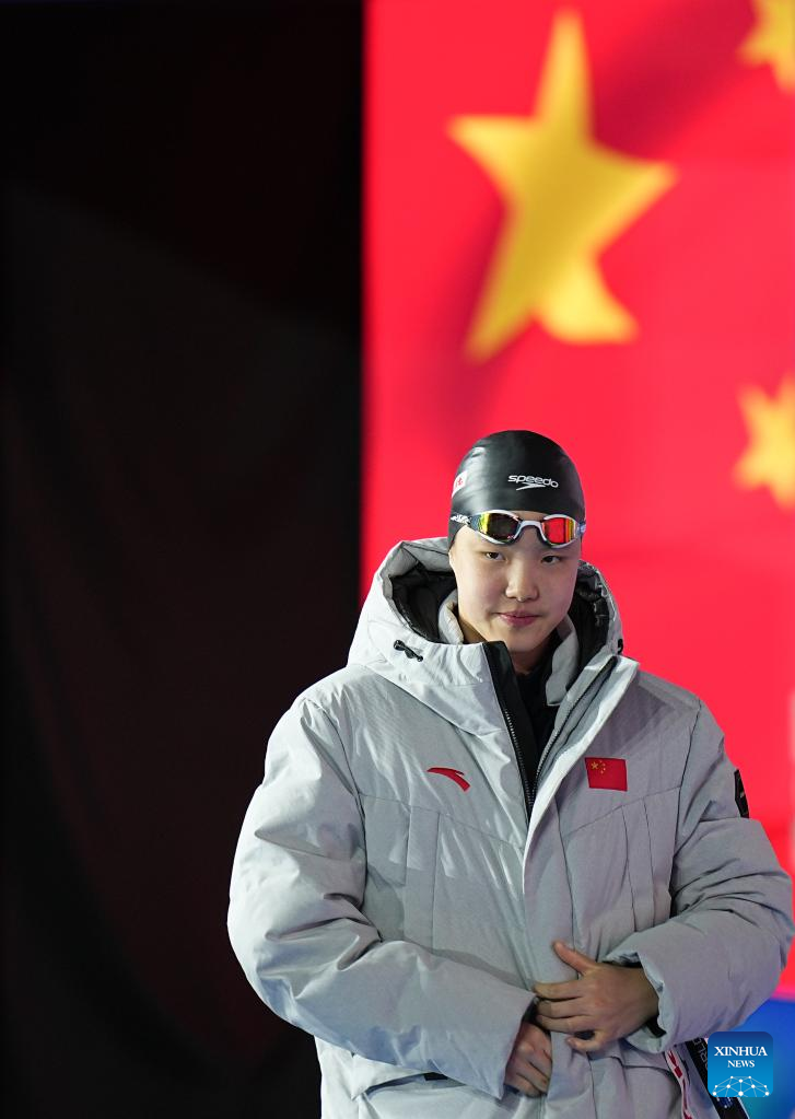 Yu Zidi (C) of China is seen after the women's 400m individual medley final of swimming at the World Aquatics Championships in Singapore, Aug. 3, 2025. (Xinhua/Xia Yifang)