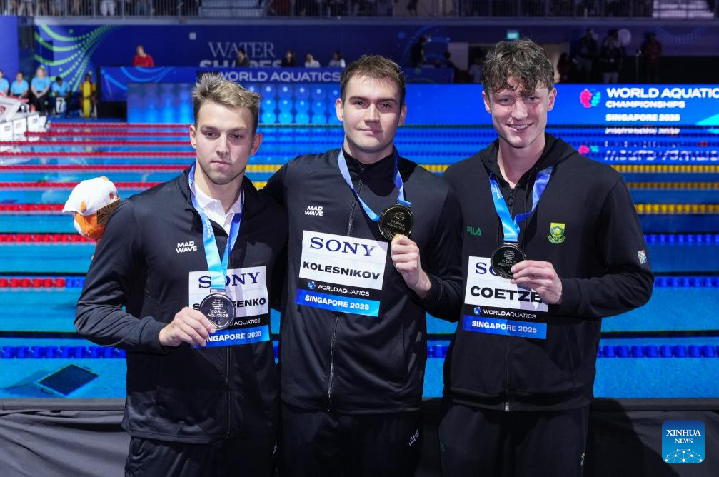 SINGAPORE, Aug. 3 (Xinhua) -- World record holder Kliment Kolesnikov stormed to victory in the men's 50-meter backstroke final at the World Aquatics Championships on Sunday.