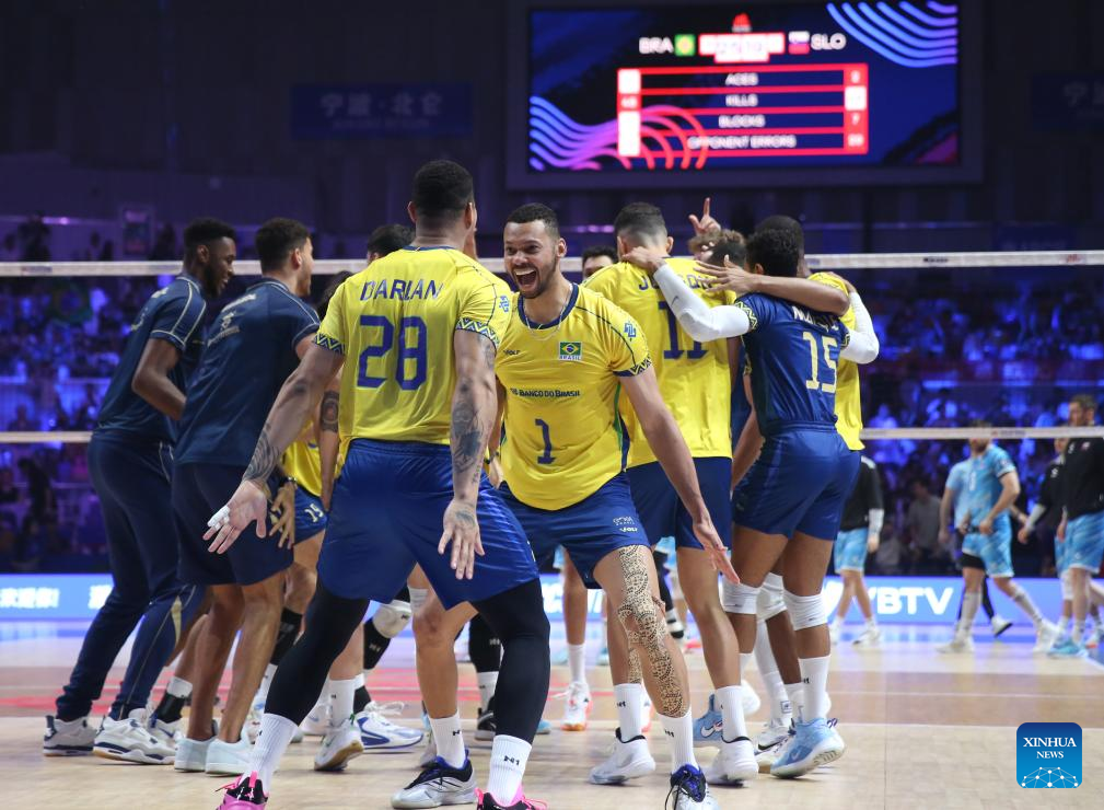 Maique Reis Nascimento (C) of Brazil celebrates during the 3rd place match between Slovenia and Brazil at the 2025 Volleyball Nations League (VNL) Men's Final Round in Ningbo, east China's Zhejiang Province, Aug. 3, 2025. (Photo by Suo Xianglu/Xinhua)