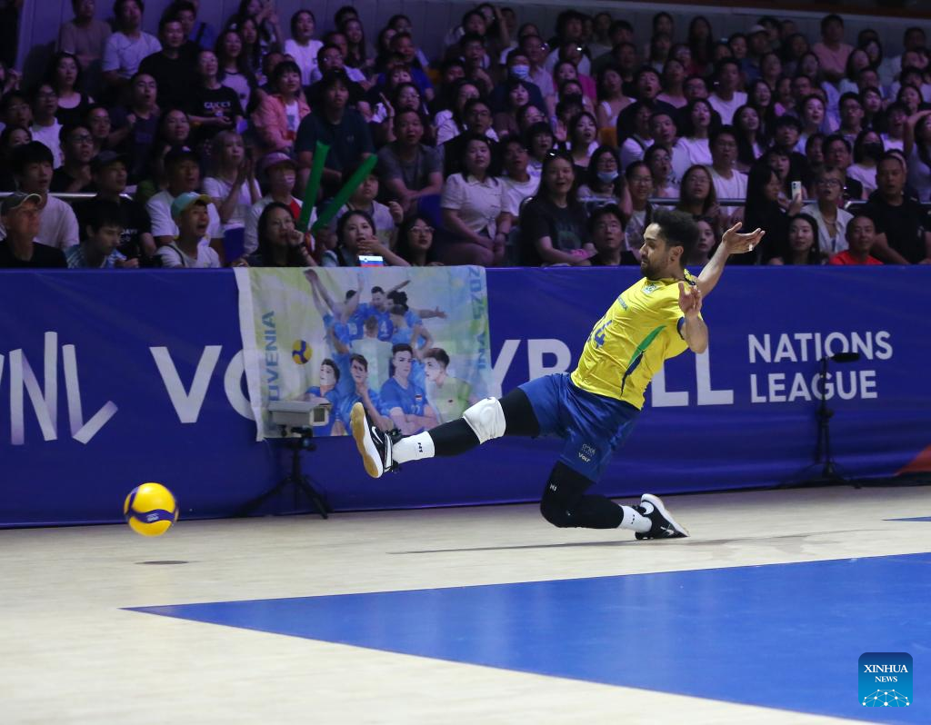 Maique Reis Nascimento (C) of Brazil competes during the 3rd place match between Slovenia and Brazil at the 2025 Volleyball Nations League (VNL) Men's Final Round in Ningbo, east China's Zhejiang Province, Aug. 3, 2025. (Photo by Suo Xianglu/Xinhua)
