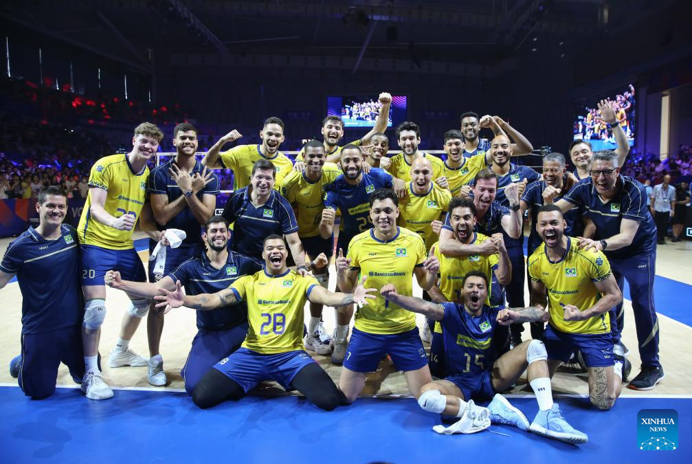 Players of Brazil celebrate during the 3rd place match between Slovenia and Brazil at the 2025 Volleyball Nations League (VNL) Men's Final Round in Ningbo, east China's Zhejiang Province, Aug. 3, 2025. (Photo by Suo Xianglu/Xinhua)