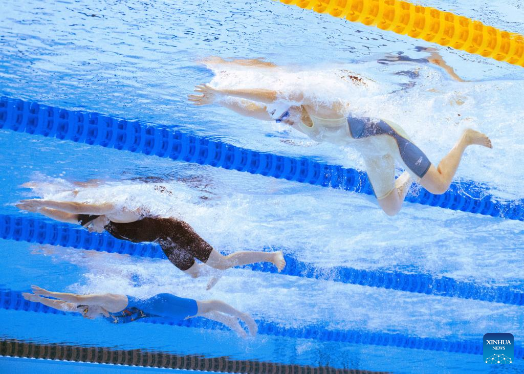 Zhang Yufei (top) of China competes during the women's 4X100m medley relay final of swimming at the World Aquatics Championships in Singapore, Aug. 3, 2025. (Xinhua/Xue Yuge)