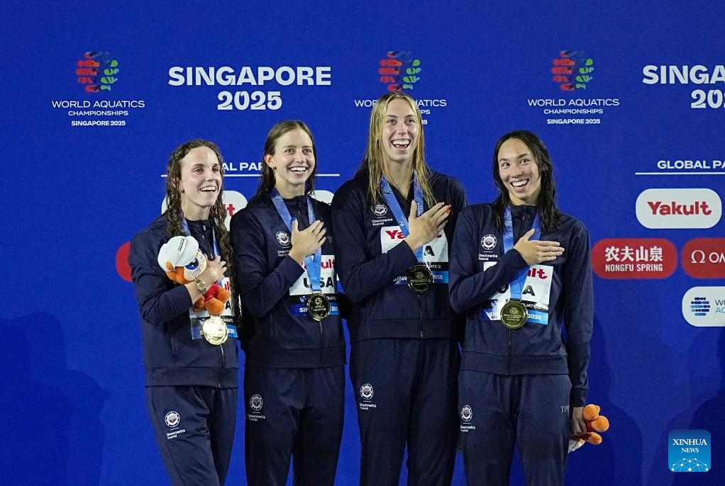 Team the United States are seen during the awarding ceremony for the women's 4X100m medley relay final of swimming at the World Aquatics Championships in Singapore, Aug. 3, 2025. (Xinhua/Xia Yifang)