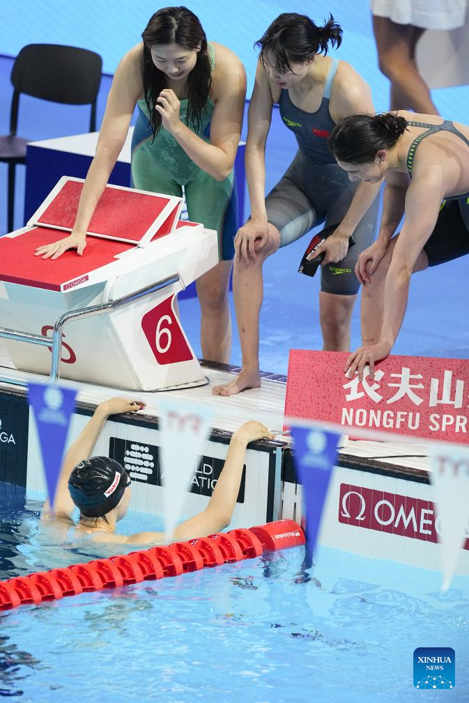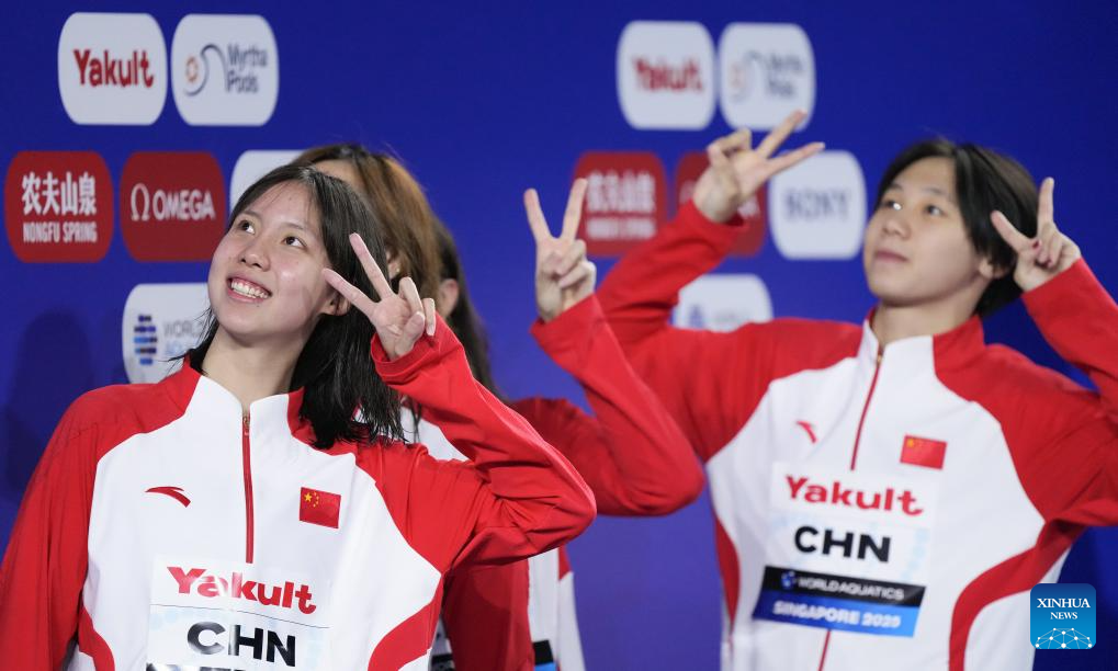 Team China's Zhang Yufei (2nd L) is seen after the women's 4X100m medley relay final of swimming at the World Aquatics Championships in Singapore, Aug. 3, 2025. (Xinhua/Luo Yuan)