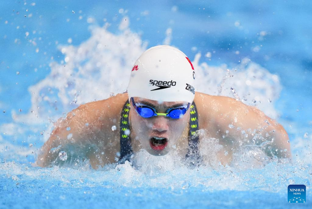 Team China's Zhang Yufei competes during the women's 4X100m medley relay final of swimming at the World Aquatics Championships in Singapore, Aug. 3, 2025. (Xinhua/Xue Yuge)