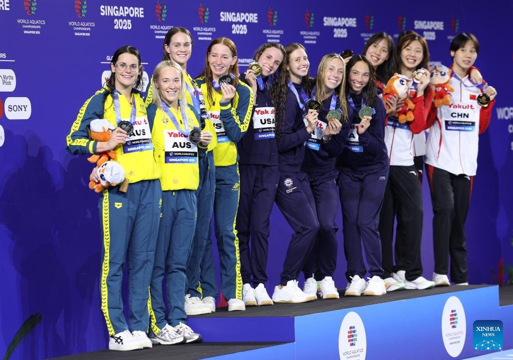 Gold medalists Team the United States (C), silver medalists Team Australia (L) and bronze medalists team China pose during the awarding ceremony for the women's 4X100m medley relay final of swimming at the World Aquatics Championships in Singapore, Aug. 3, 2025. (Xinhua/Luo Yuan)