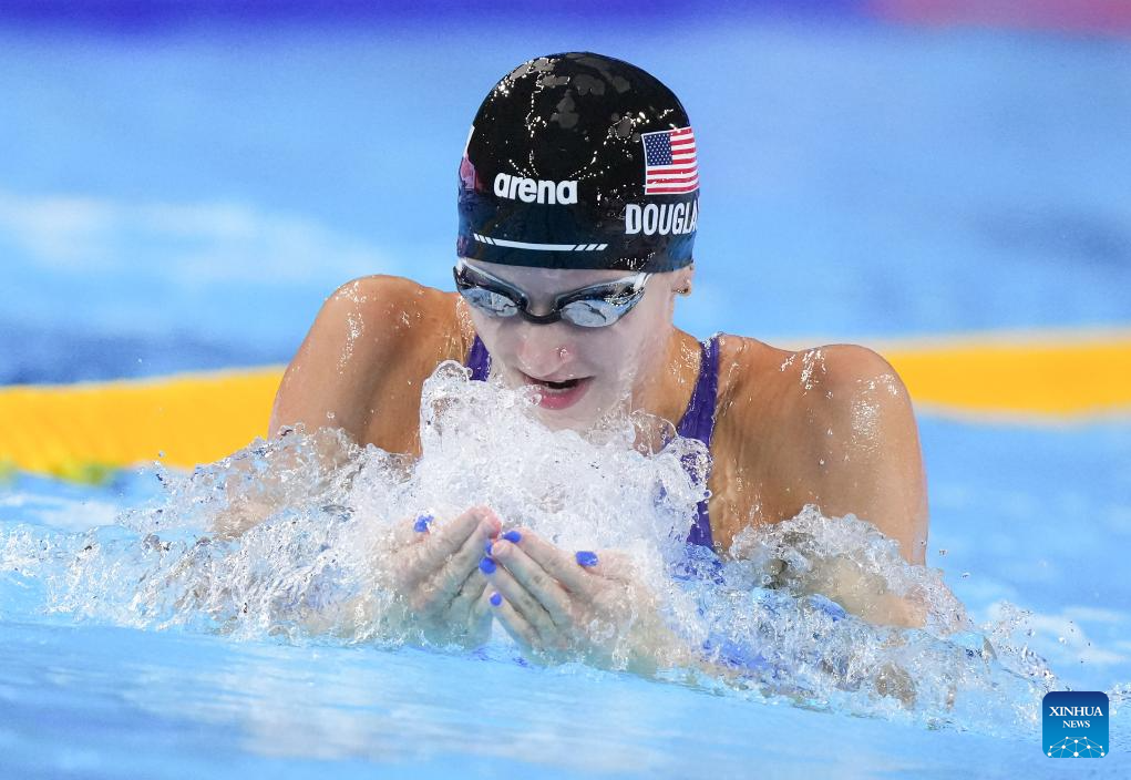 Team the United States' Kate Douglass competes during the women's 4X100m medley relay final of swimming at the World Aquatics Championships in Singapore, Aug. 3, 2025. (Xinhua/Luo Yuan)